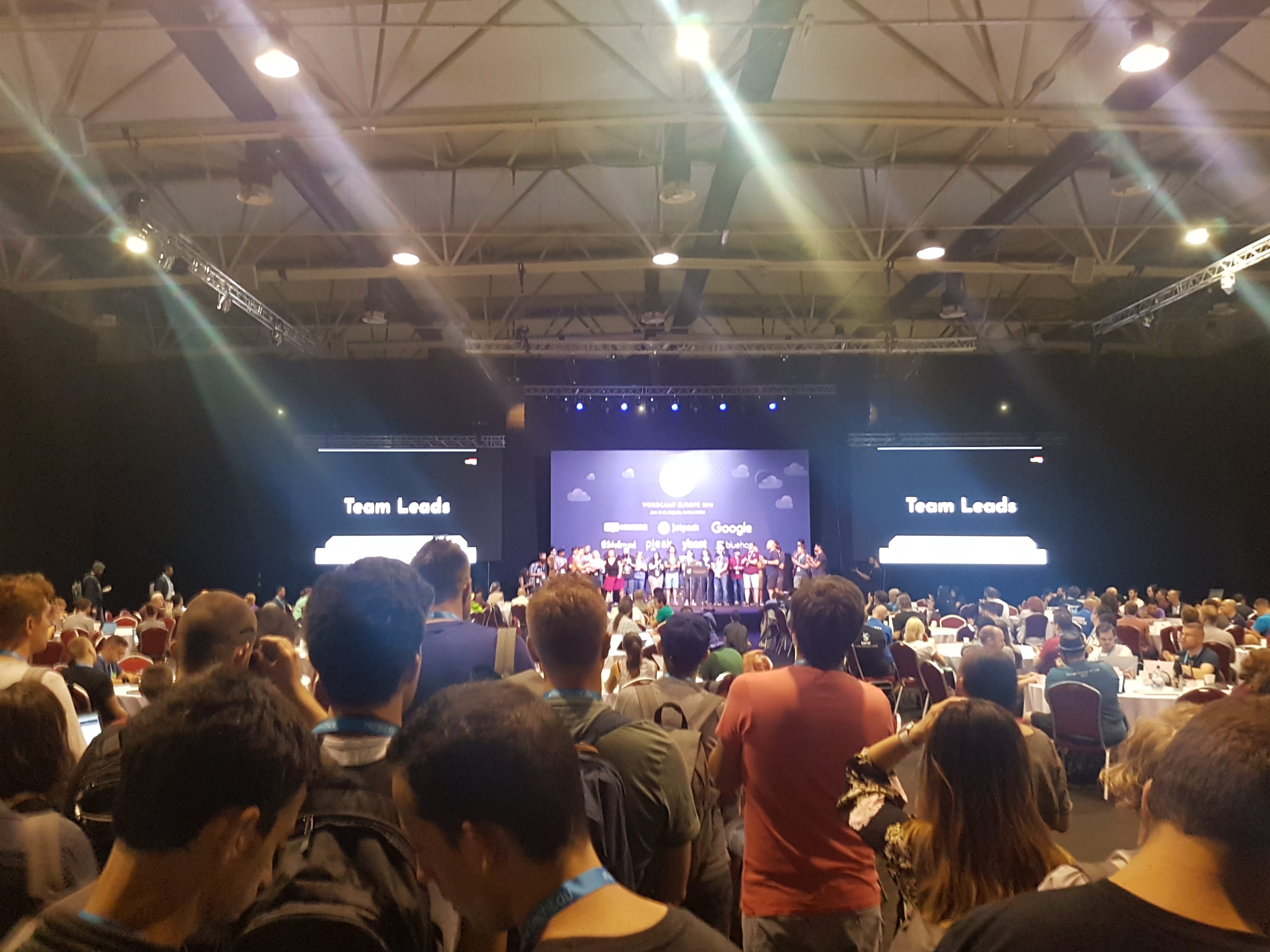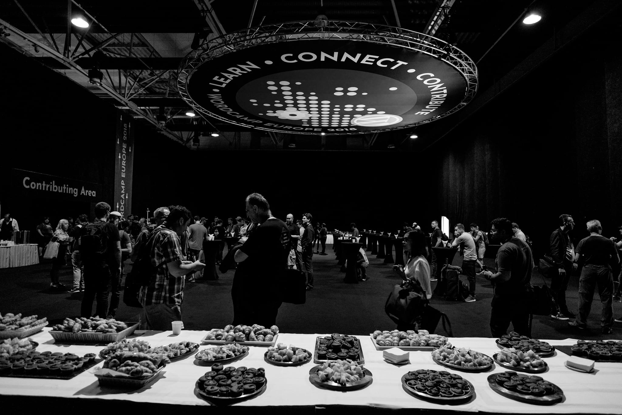 In the first section of the venue, breakfast, coffee, fruit, and juices were already set on tables to give us a boost for the day to come, and the waiters kindly serviced all of our needs, with the logo of WCEU hanging above our heads from the ceiling. At the same time, in the main room, round tables were set for all teams to contribute to WordPress. You could choose your spot at the table that better fitted what you had to offer to WordPress among Accessibility, BuddyPress, CLI, Coding standards, Community, Core, Core: Docs, Core: Editor (Gutenberg), Core: JavaScript, Core: Rest API, Core: Security, Design, Documentation, GDPR and privacy, Hosting, Marketing, Meta, Mobile, Polyglots, Support, Themes, Tide, Training and WordPress TV.